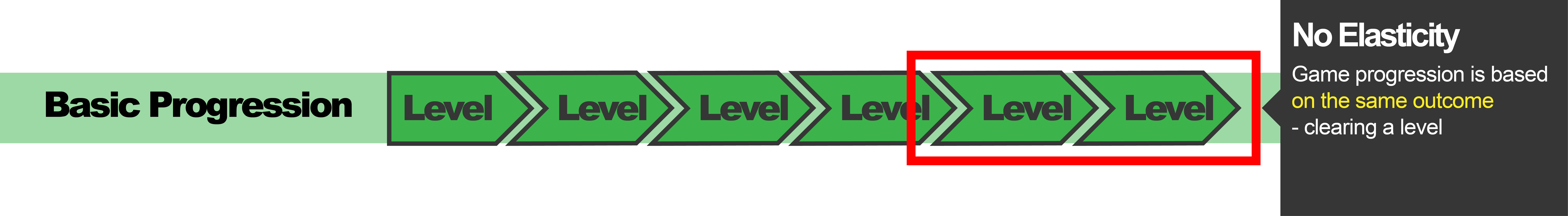 Basic game progression requires the player to complete the core loop in order to advance. In many games, a single core game mechanic such as matching puzzle pieces or a collection of core gameplay activities like fighting a battle are enclosed in levels. Completing one level will unlock the next level. New levels will introduce new mechanics, feature new artwork or spice things up in any other way. This type of progression does not feature any elasticity in the sense of this article, progression is binary, WIN to progress, FAIL and stand still.