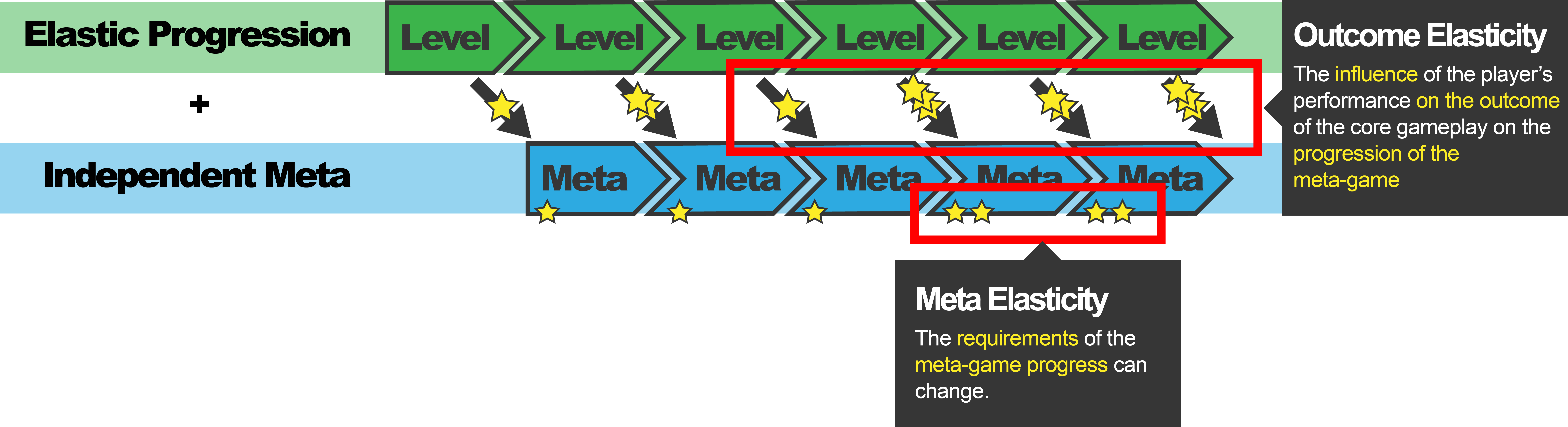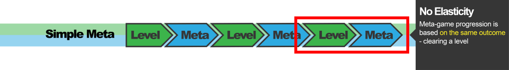 Here, the progression of the Meta-game is flexible, displaying elasticity. The amount of levels that the player needs to complete is independent and detached from the progression of the meta.